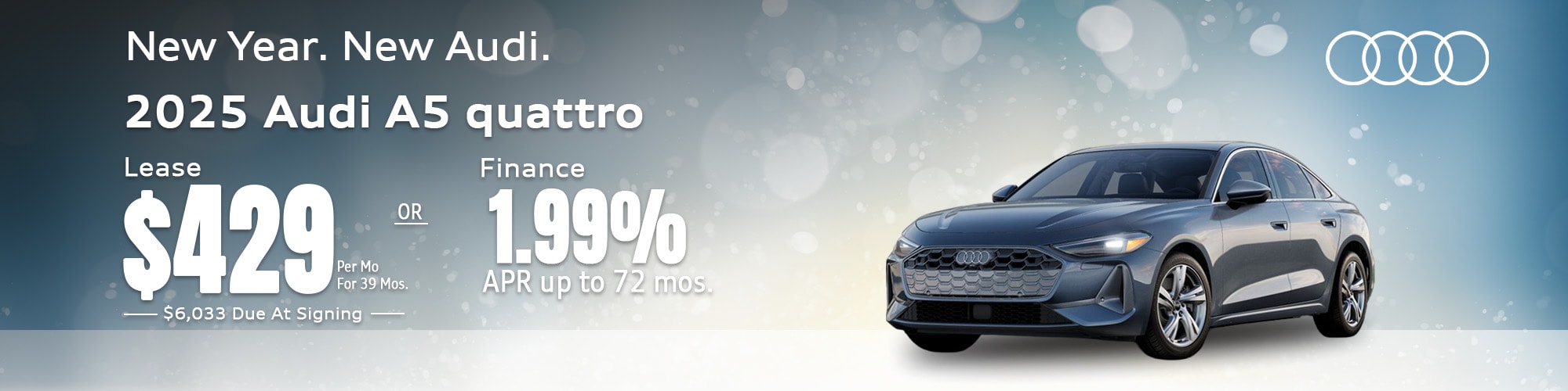 Lease 2025 Audi A5 quattro for $429 per month for 39 months. $6,033 due at signing includes $895 acquisition fee, $429 first month's payment, and $4,709 down payment. MSRP is $54,025, with an end-of-term purchase option of $31,334.50. This lease includes 10,000 miles per year. Disposition fee: $495. Purchase option: $395. Over mileage penalty: $0.25/mile. Plus tax, tag, title, and dealer fee. With approved credit through Audi Financial Services. See dealer for details. Offer ends 02/02/2026. Or finance at 1.99% APR up to 72 months.