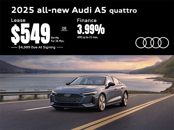 Lease 2025 all-new Audi A5 quattro for $549 /mo. 36 mos., $4,989 Due at signing, Includes $895 acquisition fee + $549 1st month + $3,545 Down payment. MSRP: $54,025, EOT Purchase Option: $32,415, 10,000 miles/year. Disposition Fee: $495. Purchase option: $395. Over mileage penalty: $0.25/mile. Plus tax, tag, title & dealer fee. With approved credit thru Audi Financial Services. See dealer for details. Offer ends 11/03/2025. Or Finance: 3.99% up to 72 months.