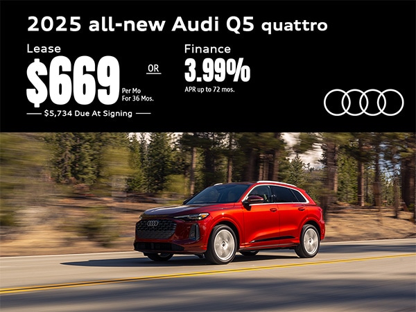 Lease 2025 all-new Audi Q5 quattro for $669 /mo. 36 mos., $5,734 Due at signing, Includes $895 acquisition fee + $669 1st month + $4,170 Down payment. MSRP: $57,140, EOT Purchase Option: $33,712.60, 10,000 miles/year. Disposition Fee: $495. Purchase option: $395. Over mileage penalty: $0.25/mile. Plus tax, tag, title & dealer fee. With approved credit thru Audi Financial Services. See dealer for details. Offer ends 11/03/2025. Or Finance: 3.99% up to 72 months.
